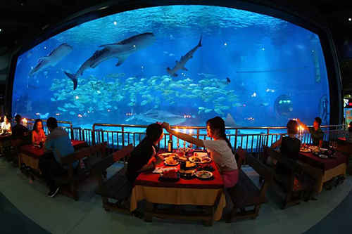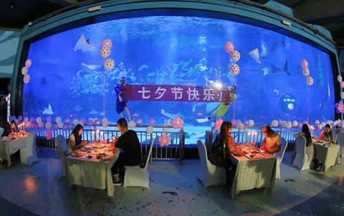 “七夕海底晚宴”是煙臺鯨鯊海洋公園針對七夕節,特別開放的浪漫夜場,是為相愛情侶互訴衷腸表達愛意的一次浪漫旅程。在鯨鯊的陪伴下,在精致西餐、浪漫燭臺、精彩表演的氣氛烘托下,新鮮牛排、披薩、時蔬、水果沙拉挑逗戀人的味蕾,浪漫的海底氛圍將記錄你們恒久不變的愛情!