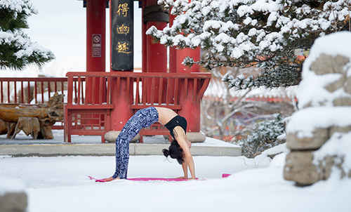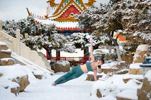 12月12日,常在溫暖瑜伽房內練功的美女走出溫室,來到銀裝素裹的三仙山景區做起了瑜伽,姿態美不勝收。