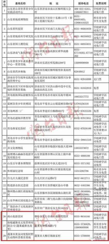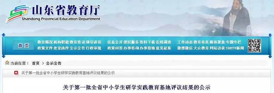 根據(jù)《教育部等11部門(mén)關(guān)于推進(jìn)中小學(xué)生研學(xué)旅行的意見(jiàn)》(教基一〔2016〕8號(hào))、《山東省教育廳等12部門(mén)關(guān)于推進(jìn)中小學(xué)生研學(xué)旅行工作實(shí)施方案的通知》(魯教基發(fā)〔2017〕2號(hào))精神,根據(jù)省教育廳、省旅游發(fā)展委員會(huì)《關(guān)于遴選推薦中小學(xué)生研學(xué)實(shí)踐教育基地的通知》(魯教基函〔2017〕26號(hào))要求,在省直有關(guān)部門(mén)和各市級(jí)教育行政部門(mén)、旅游發(fā)展部門(mén)推薦基礎(chǔ)上,經(jīng)專家評(píng)議,擬命名山東省山青世界青少年實(shí)踐活動(dòng)中心等65個(gè)單位為第一批“全省中小學(xué)生研學(xué)實(shí)踐教育基地”,現(xiàn)予以公示。
