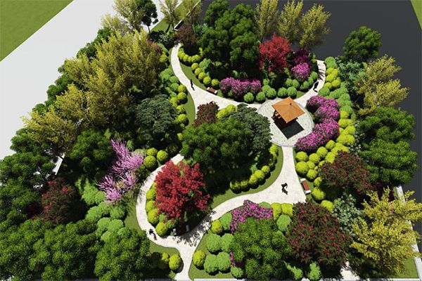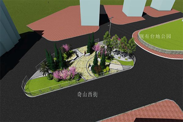 改造方案:采用灰白色透水磚鋪設(shè)地面;加設(shè)弧形座椅,放置小型活動器械,方便居民活動;西側(cè)及東側(cè)圍墻開設(shè)出入口,方便居民進(jìn)出;綠化選用整形(圓球行)蜀檜球形成樹陣;種植紅花紫薇、櫻花、紅楓、紫葉李等,造型油松點綴整個區(qū)域,對現(xiàn)有雪松、龍爪槐、蜀檜修剪成型;灌木選用紅葉石楠、金森女貞常綠灌木搭配上木烘托整個游園氣氛。