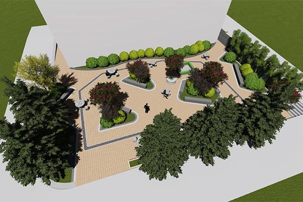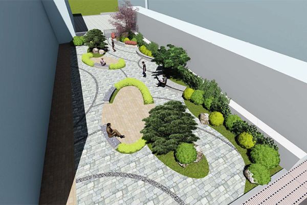 改造方案:園內(nèi)鋪裝透水磚,調(diào)節(jié)周邊環(huán)境濕度和溫度;配搭若干樹池及弧形石材座椅,鋪裝弧形多變的甬路,給空間帶來舒適的延展性;保留原有大樹并修剪成型;新增樹形優(yōu)美的花灌木使整個活動區(qū)域更加生動;修剪原有蜀檜,增加紫葉李、紅楓、櫻花,常綠與落葉交替搭配使整個空間景色常在,四周增設(shè)安全護(hù)欄加以保護(hù)。