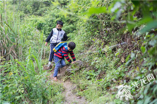 對于銅鑼村的孩子們來說,上學的不容易可不僅僅體現(xiàn)在距離上。近日,記者和孩子們一起走進芙蓉洞口通往銅鑼村的這條必經(jīng)之路,親身感受了一次他們的上學路。由于天空下著小雨,這條陡峭的山路顯得更不好走,冉云峰和同村的幾個孩子在狹窄的小路上相伴而行,還沒走幾步鞋上就沾滿了泥,實在是遇上一個人走不過的陡坡,孩子們就會走拉著手一起扶持前行。