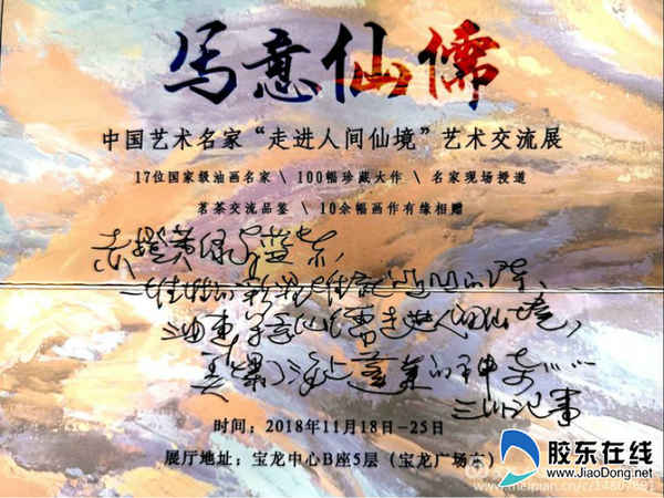 2018年11月18日,由蓬萊市文廣新局主辦的中國藝術名家“寫意仙儒”走進人間仙境藝術交流展,在蓬萊寶龍中心b座盛大開展。本次活動由蓬萊助殘志愿者服務隊、仙境愛心自愿者協會、中小微企業聯合會、女企協等單位人員協辦,中國品格繪畫寫意油畫研究院、十甲國際文化發展有限公司給予學術支持。17位國家級畫家的100幅作品,以形寫神,形神兼備,生動地展現了蓬萊及沿海美麗風光。活動當中,名家現場授道,為到現場參觀的殘疾人士贈送書畫,意義非凡。