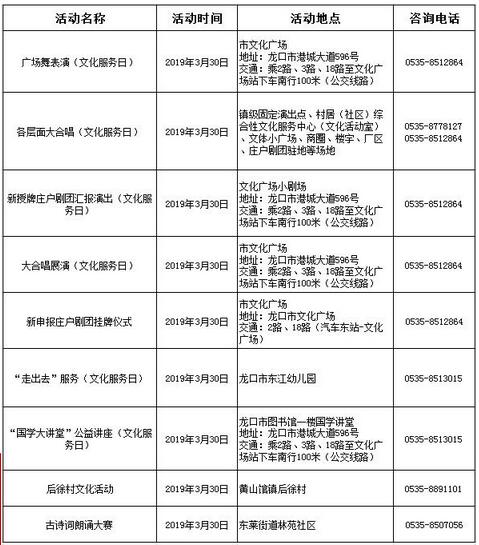 首屆煙臺市民文化節龍口分會場開幕式暨“文化服務日”活動將于3月30日上午9:00正式開幕!龍口分會場設在文化廣場,精彩節目等你來呦!