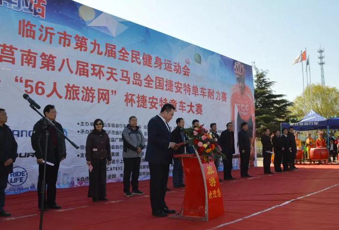 2019年3月31日,“2019中國·莒南第八屆環(huán)天馬島全國捷安特單車耐力賽‘捷力100’莒南站暨‘56人旅游網(wǎng)’杯捷安特童車大賽”在天馬島旅游區(qū)隆重開幕。春日的天馬島,微風(fēng)徐徐,檢票廣場鮮紅的國旗迎風(fēng)飄揚(yáng)。開幕式會場上,旌旗林立,怒馬鮮衣。來天馬島參加環(huán)湖自行車比賽的各市縣俱樂部代表隊英姿颯爽,斗志昴揚(yáng),展示了意氣風(fēng)發(fā)、積極向上的精神風(fēng)貌。陣陣歡聲笑語從身著五彩繽紛騎行服參賽隊員的人群里不時地傳出,每位參賽隊員的臉上洋溢著剛毅與自信,翹首期盼著比賽的正式開始。