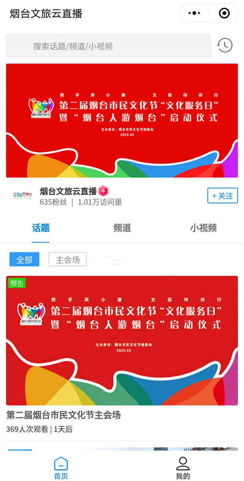 2、微信搜索“煙臺文旅云”小程序并進入,點擊【市民文化節】彈窗即可查看直播。