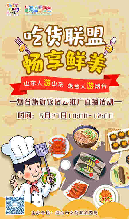5月27日10:00-12:00在“煙臺文旅云”直播平臺參與煙臺旅游飯店“限時惠購”+8輪抽獎+抽取”吃貨王“大獎,8家飯店直播展示特色、優惠產品和招牌美食。