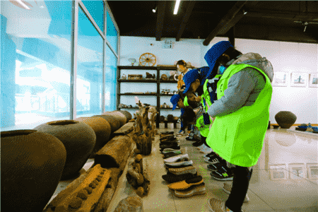 親子家庭們來到了青年藝術家付軍勝在“漁號小鎮”的藝術品展廳。展廳里擺放著他用海洋垃圾精心制作的藝術展項。