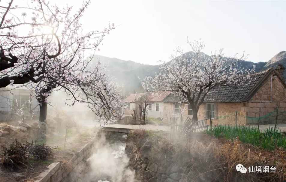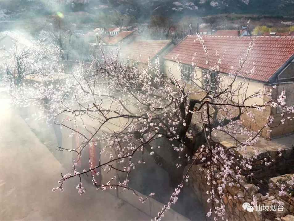 太陽的映照下,杏花樹旁晨霧繚繞。 攝影:王聯興