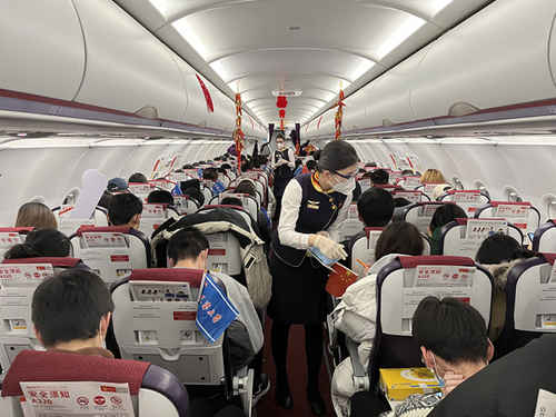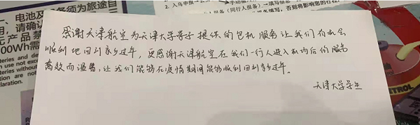 為降低感染風險,組織學生間隔排隊辦理值機手續。根據實際情況,地服工作人員提前為學生旅客配備清真餐食和飲用水,引導大家間隔就座。臨近農歷新年,為營造良好的客艙氛圍,乘務員們提前準備了溝通卡,共有98名學生寫下回家的喜悅之情,以及對天津航空全流程服務的感謝之情。學生們紛紛表示“感謝天津航空為天津大學學子提供的包機服務,讓我們有機會能順利回到家鄉過年,天津航空為我們提供的服務高效而溫馨,為天津航空點贊!”“沒想到居然可以體驗包機回家,謝謝天津航空所有人的終日奔波護送游子飛回故土,這次的飛行之旅很有意義!”“非常感謝天津航空在這次歸家途中的陪伴與帶給我們的驚喜!感謝相遇!這是一次難忘的旅程!”