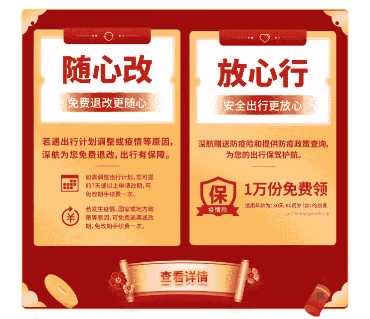 針對近期疫情散發,旅客出行影響較大,深航推出 “雙心承諾”產品,承諾讓每位旅客“隨心改、放心行”。若遇出行計劃調整或疫情等原因,在指定期間提前7天客票可免費退票或免改期費一次。針對30-80歲的旅客將贈送一萬份防疫險,提供便捷防疫政策查詢,全力為旅客的出行保駕護航。