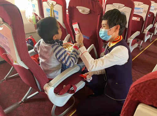 圖 乘務(wù)員幫助無陪兒童進(jìn)餐
