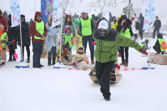 家長(zhǎng)和孩子們自制雪橇比賽(圖由西嶺雪山景區(qū)提供)