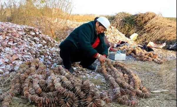 漁民們把大堆的扇貝殼搬運(yùn)回家,在每片貝殼的中央敲一個(gè)孔,將它們串起來(lái),再投放到已養(yǎng)殖了大面積海蠣子的海區(qū),繁殖季節(jié),它們的受精卵就附著在貝殼串上。
