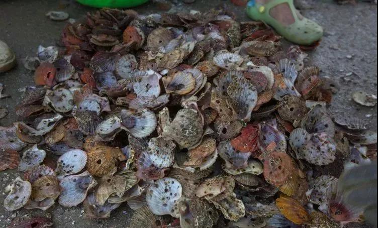 布滿(mǎn)了黑色斑點(diǎn)的扇貝殼被從繩子上抖落下來(lái)。