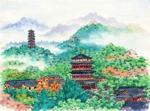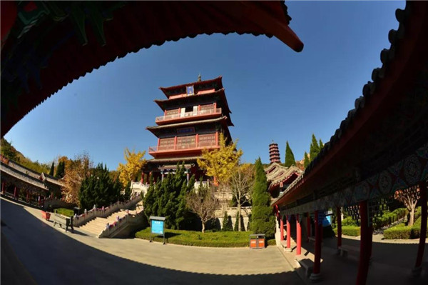 赤山閣:赤山閣高34米,共分三層,主要展示了博大精深的佛教文化。一層塑有釋迦牟尼佛像,二層塑有鑒真像,三層塑有觀音菩薩像。此外赤山閣還有多幅壁畫,表現手法以寫實的傳統工筆重彩為主,融入西洋畫、年畫、連環畫等多種元素,力求畫面生動活潑,人物形象逼真。壁畫分為三部分:一樓為《釋迦牟尼八相成通》;二樓為《中國高僧傳》;三樓為《中國四大菩薩》。其中“高僧傳”壁畫是目前我國所有寺廟中唯一的一套反映中國歷代高僧的工筆重彩壁畫。它收錄了自東漢明帝年間印度高僧攝摩騰首次來中國弘法到民國時期弘一法師李叔同圓寂共24位高僧,展示了自漢明帝時期到民國前后共1800多年的中國佛教史。