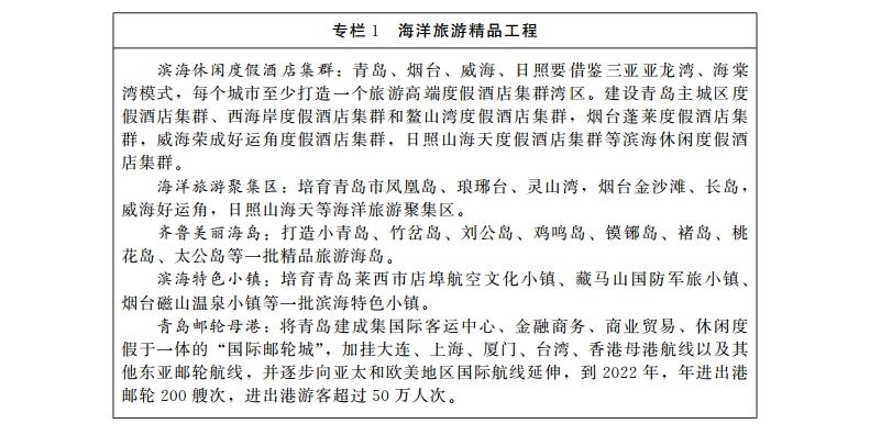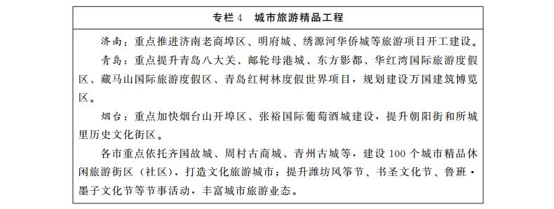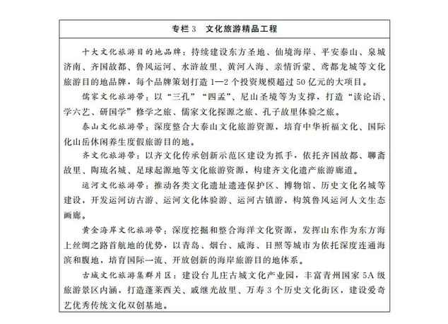 建設6大精品旅游發展高地:曲阜東方圣城中國傳統文化精品旅游發展高地,齊國故都齊文化精品旅游發展高地,沂蒙紅色文化精品旅游發展高地,青煙威精品海洋旅游發展高地,黃河三角洲生態文化精品旅游高地,濟南泉文化精品旅游高地。