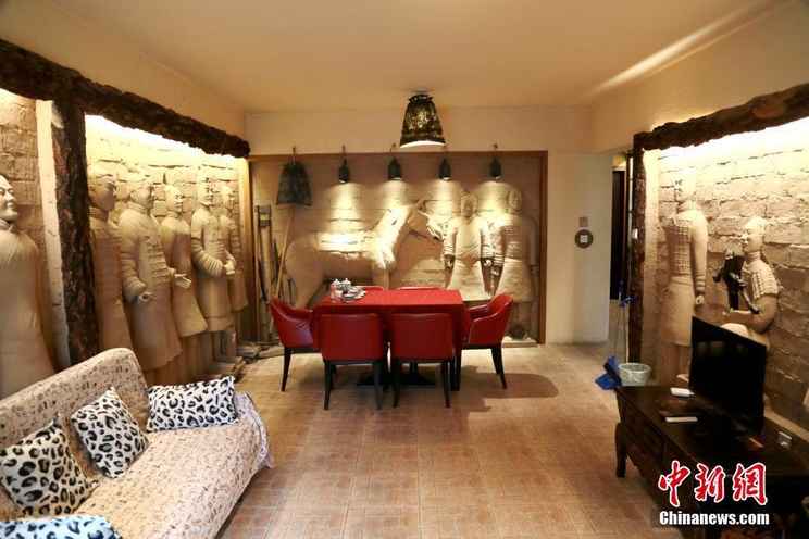 11月27日,民宿客廳四周皆有“兵馬俑”守衛。近日,西安一家主打“兵馬俑”元素的民宿走紅,“兵馬俑”元素遍布在房間各個角落,“深情注視”著在此休憩的旅客,加上昏黃的燈光及復古的裝飾,讓不少旅客感嘆如同居住在“秦始皇陵”。中新社記者張遠攝