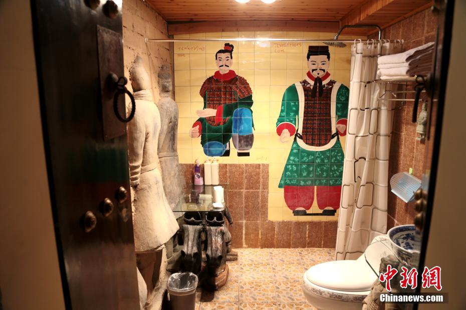 11月27日,民宿衛生間內的“兵馬俑”裝飾。近日,西安一家主打“兵馬俑”元素的民宿走紅,“兵馬俑”元素遍布在房間各個角落,“深情注視”著在此休憩的旅客,加上昏黃的燈光及復古的裝飾,讓不少旅客感嘆如同居住在“秦始皇陵”。中新社記者張遠攝