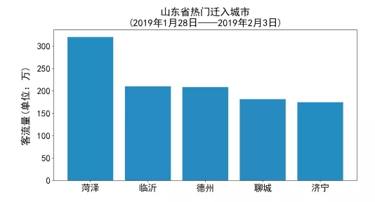 預計1月28日至2月3日期間,山東省客流遷入量大于遷出量。其中,菏澤、臨沂、德州、聊城、濟寧等城市客流遷入量排名靠前。主要客源地來自江蘇、北京、河北、河南、天津等。