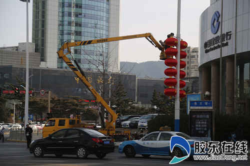 大紅燈籠高高掛,喜氣洋洋迎新年膠東在線1月30日訊(記者 李俊鋒 通訊員 王為超 金靖媛)近日,記者在煙臺市區南大街東首看到,數名頭戴安全帽的工人在高空作業車的配合下,正在安裝大紅燈籠。遠遠地望去,已經安裝的燈籠恰似一串串紅彤彤的火球在空中閃耀,為車水馬龍的大街增添了一抹喜慶的氣氛。