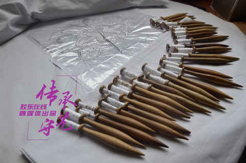 棒槌花邊,所用的是原白、漂白、本白、644色的棉線,白色的線很是嬌貴,手上有汗,油燈落灰,都會(huì)弄臟。因此,織之前,要凈手,織花邊的棒槌,用上兩三天就要擦試一遍,織好的部分,更要用白布蓋著,以防落上灰塵。