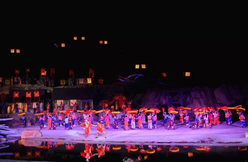 整場舞臺設計將金都招遠乃至膠東地區的有關采金、拉磨、農耕、粉絲、剪紙、婚禮場景、膠東秧歌等民俗民風民間特色一并納入其中。讓觀眾通過一臺戲了解招遠采金歷史,一臺戲讀懂膠東民俗文化,一臺戲詮釋人生……劇場依山臨水而建,氣勢磅礴,真山真水真人,在頂級的燈光舞美映襯之下,由二百余名專業的舞蹈演員精彩表演,利用現代高科技聲光電技術、舞美制作和大規模的演員陣容來演繹膠東特色文化,創造出一幅美輪美奐的畫面意境,徹底顛覆了“傳統舞臺”的表演形式,使觀眾在自然劇場中身臨其境,體驗從未有過的視覺與聽覺感受,打造了一種全新的、震撼的藝術視聽盛宴。自開演以來,獲得社會各界一致好評,彌補了招遠及周邊旅游項目的夜間空白,對整合旅游資源,拉動地方經濟,提升城市品位具有積極的意義,逐步成為招遠乃至煙臺的文化旅游城市名片。
