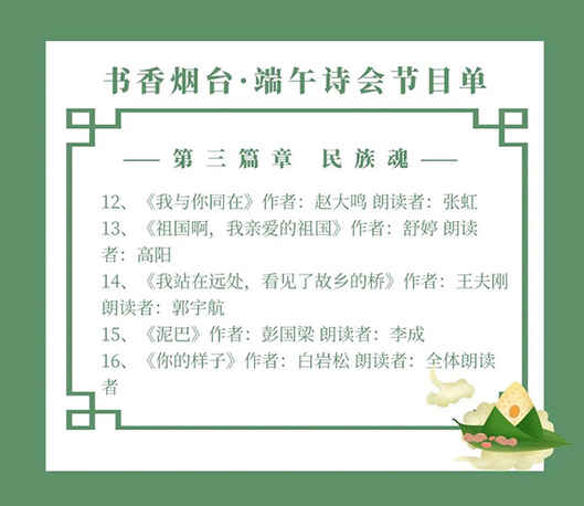 活動由煙臺市文化和旅游局主辦,煙臺市全民閱讀聯盟、煙臺圖書館誦讀書社、雅是朗讀會承辦,煙臺當當閱界協辦。詩會以傳承中華傳統文化、謳歌屈原愛國詩情、展示端午特色民俗為主線,分為“端陽日”“詩人節”“民族魂”三個篇章,共推出《美麗的季節》《海濱仲夏夜》《一棵開花的樹》《漂給屈原》《祖國啊,我親愛的祖國》《我站在遠處,看見了故鄉的橋》《漁家傲·五月榴花妖艷烘》等16個朗誦作品,既有近現代名家名篇,也有吟誦至今的宋詞絕唱,將通過全市著名朗誦家和朗誦愛好者們的傾情表演,讓經典詩文伴著美好聲音,營造濃郁的詩文押韻氛圍,緬懷偉大愛國主義詩人屈原,傳承中華民族優秀傳統文化,讓廣大市民和游客與朗誦者一起,抒發對生活的熱愛之情,對民族精神的敬仰之心。