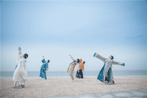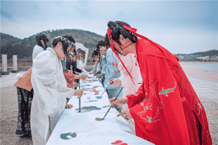 最后來到月牙灣,開展一場十米畫卷的繪畫活動,玩得起興的漢服愛好者還玩起“漢服快閃”、與海鷗共舞,又是贏得很多鏡頭。