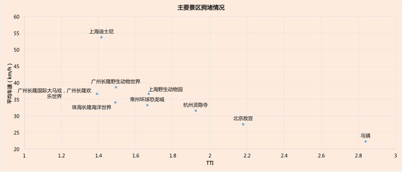 不難發(fā)現(xiàn),傳統(tǒng)的自然、人文景觀周邊道路較為擁堵。北京故宮和杭州靈隱寺的TTI指數(shù)均比較高,在遠(yuǎn)離城區(qū)的烏鎮(zhèn),擁堵指數(shù)甚至高達(dá)2.8。